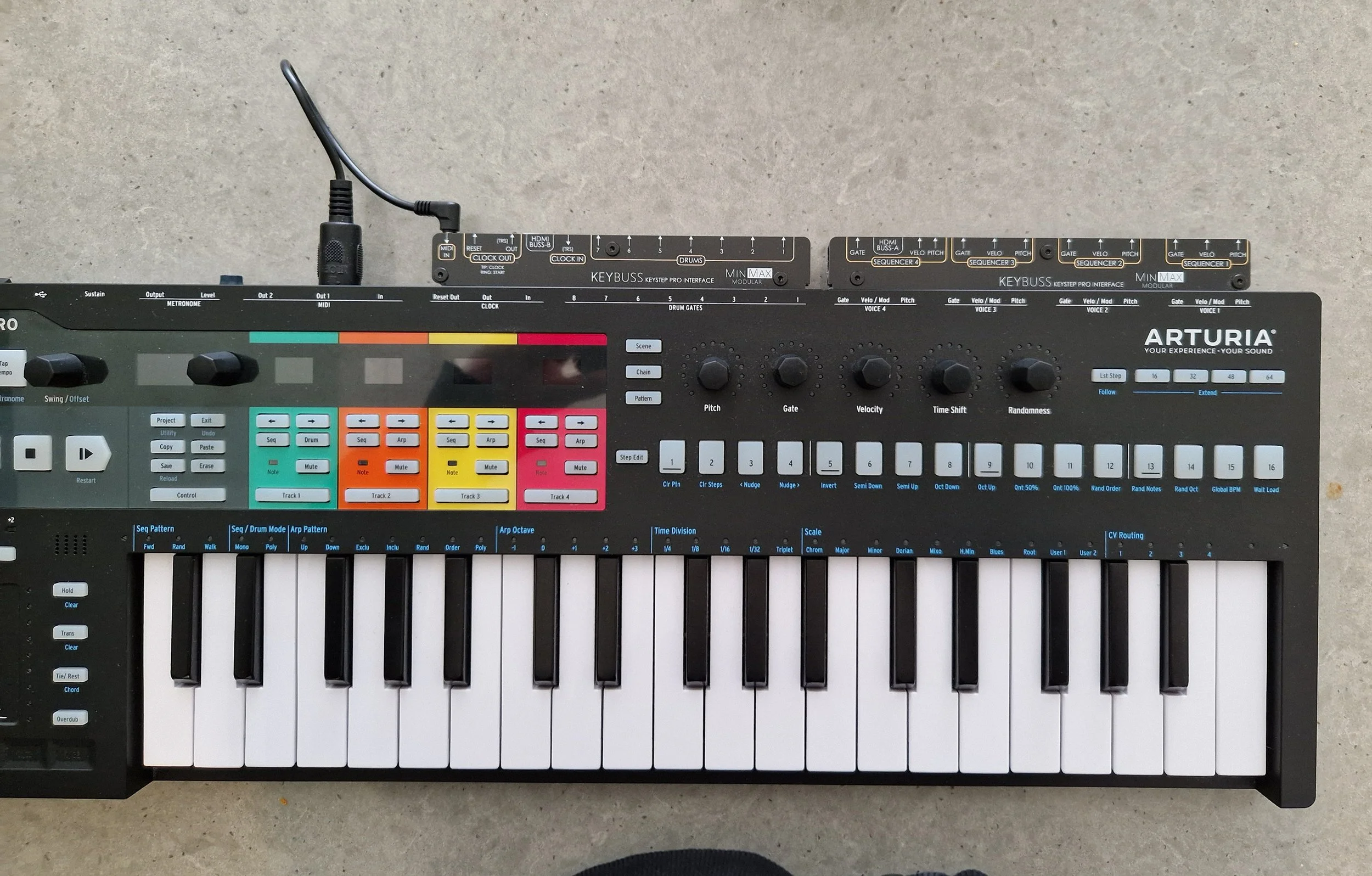 KeyBuss is a combination Eurorack module and dual plug-in boards for the KeyStep Pro. It uses 2 HDMI cables to connect to the module and offers easy access to every socket on the panel as well as all the clocking options (In and out). KeyBuss is fully buffered with very accurate and beefy opamps, and includes a 1:3 midi multiple for distributing signals within the system.